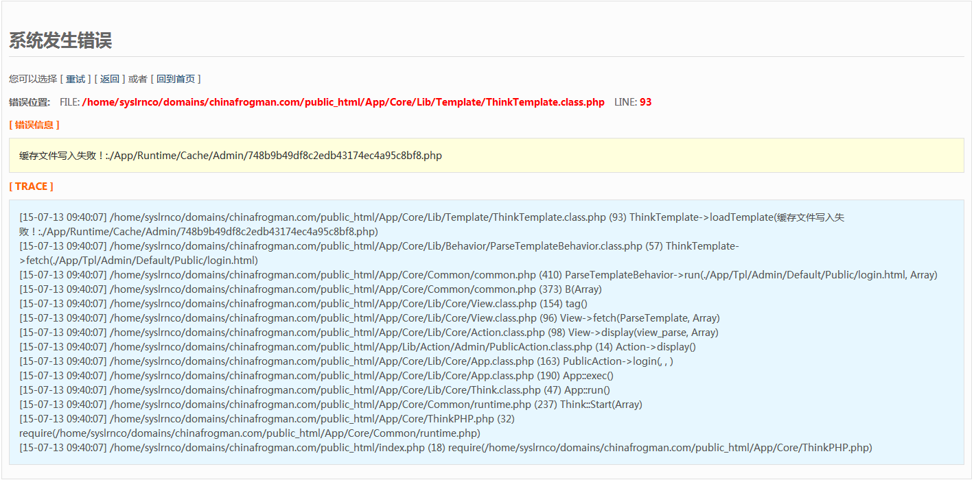 a.緩存文件沒有寫入權(quán)限 b.runtime文件不存在 c.空間磁盤已滿,無法寫入