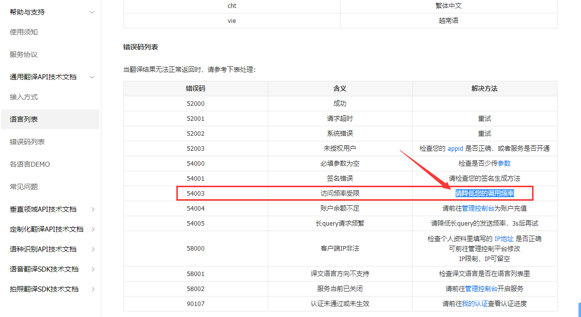 我們查找百度翻譯官網(wǎng),發(fā)現(xiàn)有一個54003的錯誤碼就是關于這個訪問頻率受限的解釋