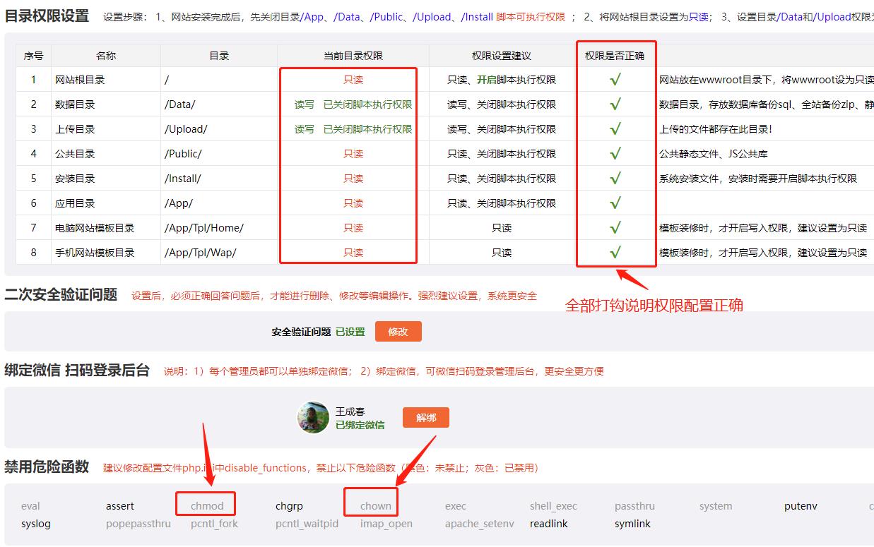 設(shè)置完成以后,登錄網(wǎng)站管理后臺,依次進(jìn)入【設(shè)置】-【安全設(shè)置】,檢查權(quán)限是否設(shè)置成功,表格【權(quán)限是否正確】顯示設(shè)置是否成功,如下圖所示: