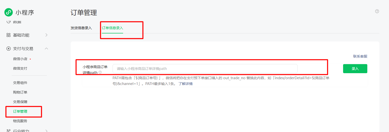 需要在【微信公眾號平臺】--【支付與交易】--【訂單管理】-- 【訂單信息錄入】中配置訂單詳情path: