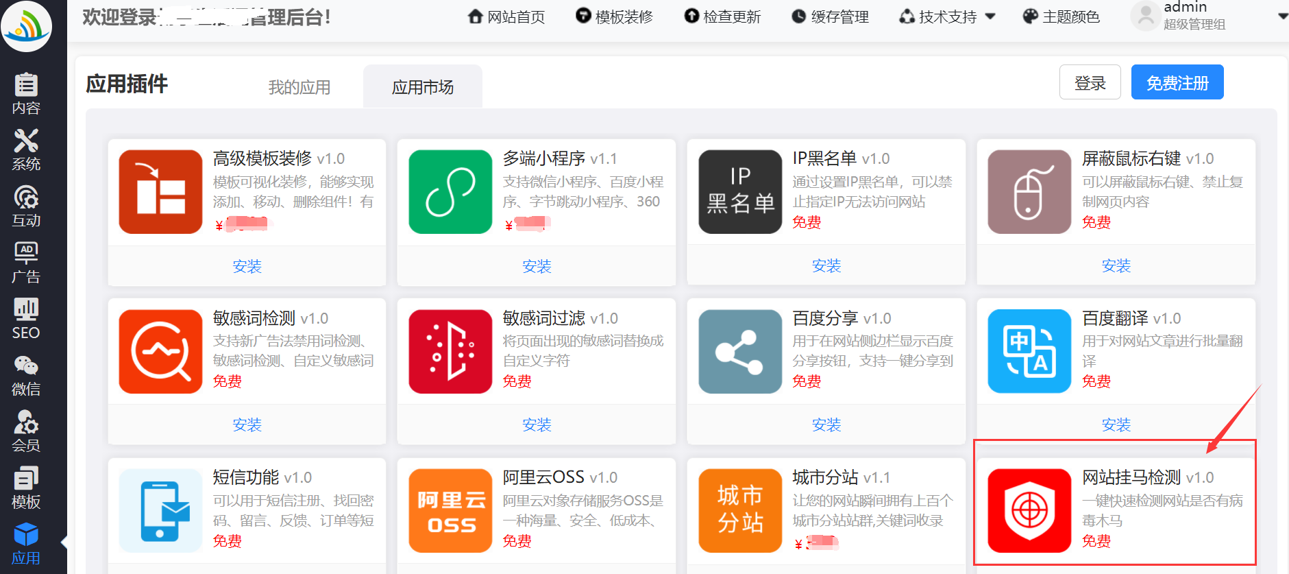 網站后臺——》應用——》我的應用——》找到“掛碼檢測插件”——》點擊安裝