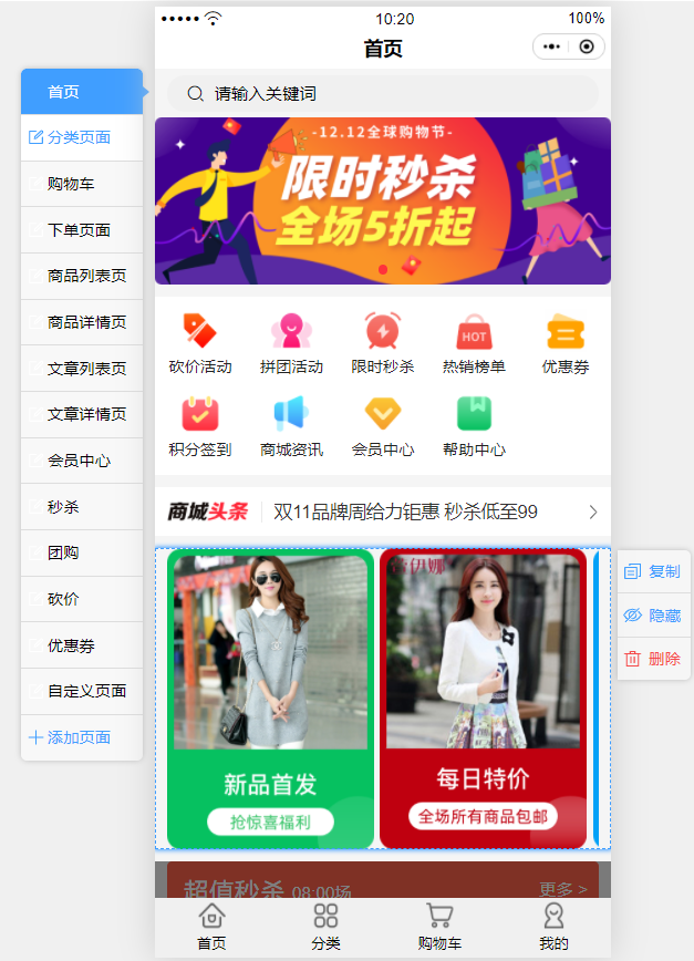 不僅首頁,列表頁,詳情頁,會員中心等頁面都可以進行DIY裝修。